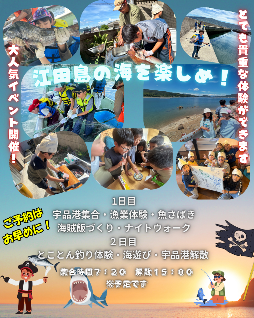 今年も人気の企画「海賊キャンプ」を開催します。山賊なのに海賊キャンプ🏴☠️江田島の海を舞台に本物の漁師さんと一緒に漁船に乗って漁をします🐟ドキドキワクワクしながら海をのぞき込む、網をあげると大漁のオサカナさん💦獲った魚を触ってさばいて食べよう!刺身、焼き、煮物、唐揚げ 魚種ごとにどうやって調理するのがベストか、みんなで考えて料理しましょう!2日目はとことん釣りをしよう🎣糸の結び方、リールの使い方、仕掛けの投げ方などしっかり勉強して魚の釣り方をマスターしよう!! 大人気企画のためキャンセル待ちの方が多くなりますので、ご予約はお早めにどうぞ!